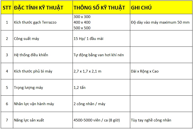 – Với nhiều năm kinh nghiệm trong ngành gạch Terrazzo cùng với đội ngũ nhân viên kỹ sư chất lượng cao, chúng tôi đã và đang chế tạo ra các sản phẩm máy ép gạch, máy mài gạch cùng với dây chuyền sản xuất gạch terrazzo chất lượng hàng đầu Việt Nam.